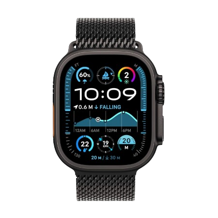 Apple Watch Ultra 2 GPS + Cellular (49mm) in Black Titanium with a Milanese Loop is available in Large, Medium/Large, and Small/Medium sizes. It features a Retina LTPO OLED Display with 2000 nits brightness, powered by the S9 SiP Chip and watchOS 10. Health tracking includes Heart Rate, ECG, SpO2, Sleep Tracking, and Fall Detection. With 100m water resistance, 36-hour battery life, and fast charging, it’s perfect for outdoor and everyday use. The watch supports GPS + Cellular for standalone calls and messages.